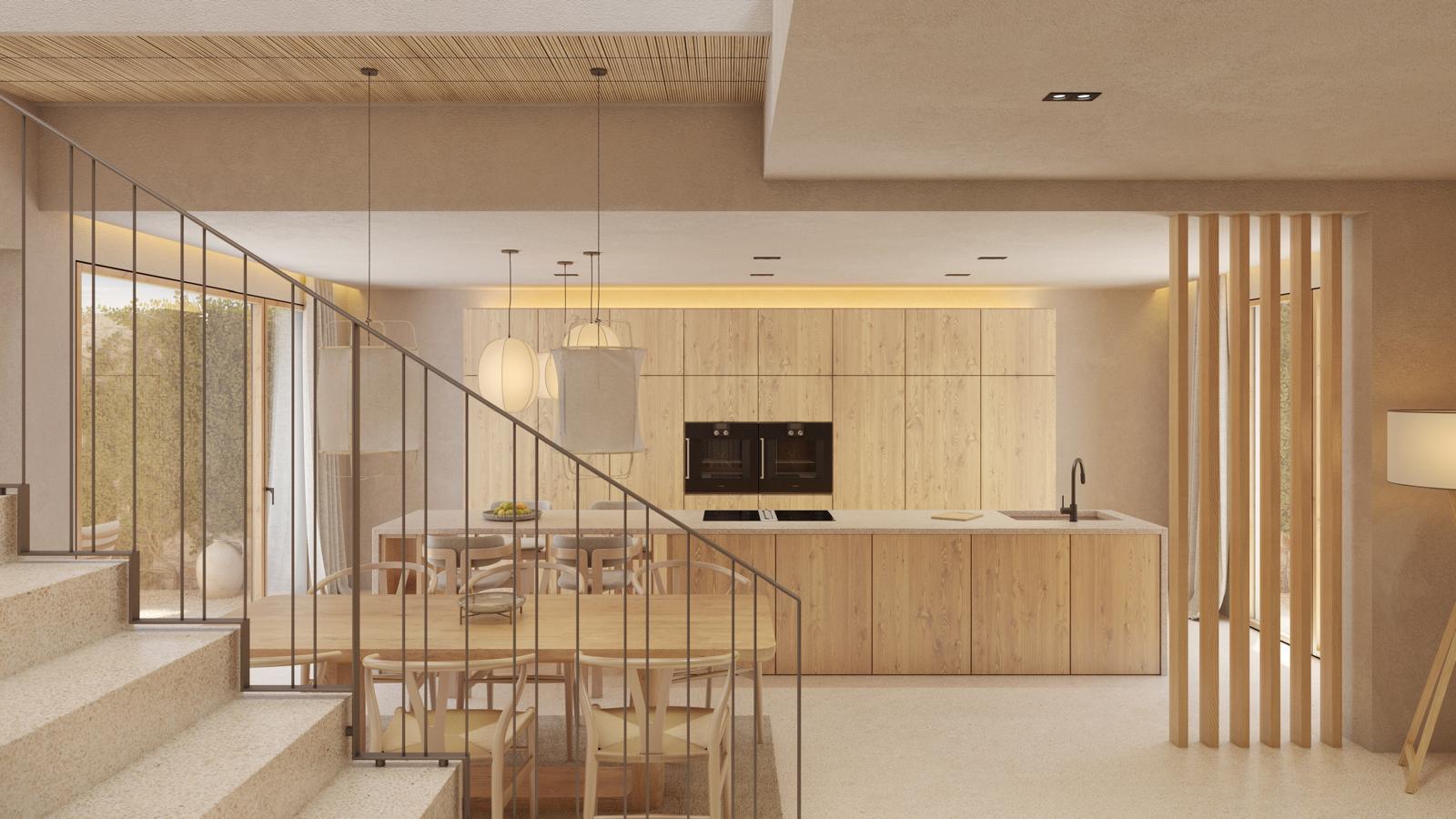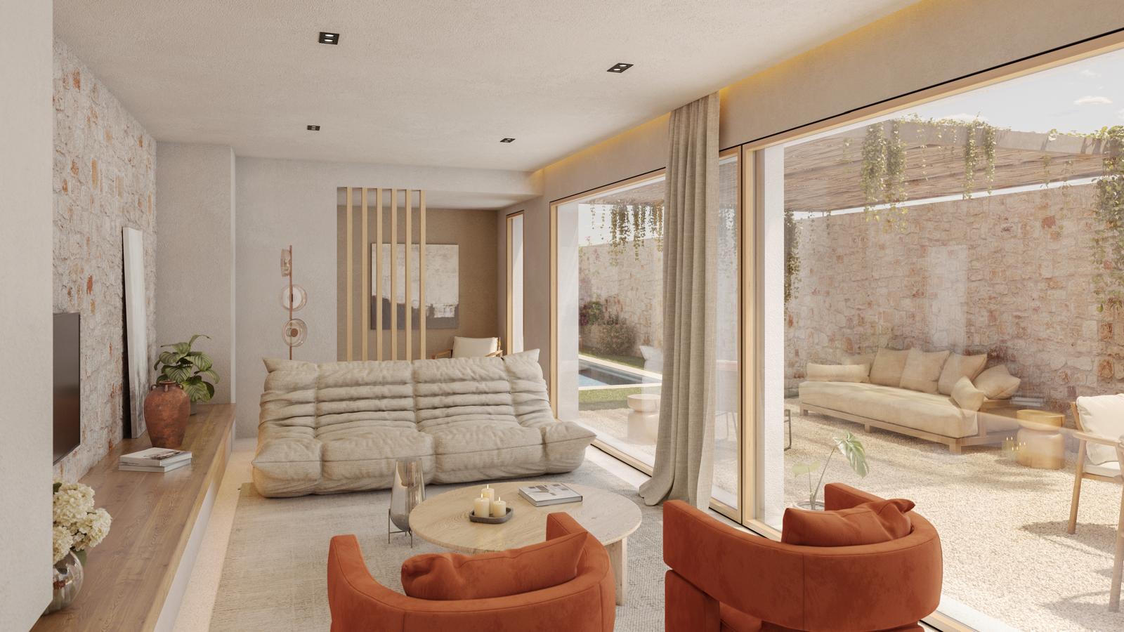 We created a space of more than 300 m2 surrounded by typical materials such as natural Santanyi stone, Marés, and wrought iron, large windows, and enclosures that envelop the space for excellent insulation.